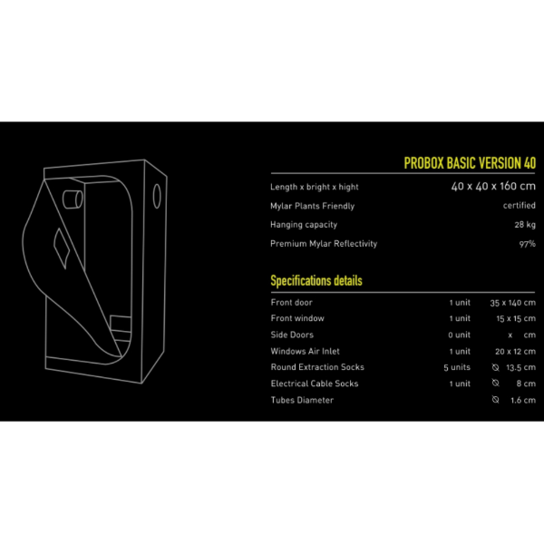 PROBOX VERSIÓN BÁSICA 4040 x 40 x 160 cmTejido resistente y duradero de nailon 420D.Estructura patentada, fuerte y estable.Reflectividad premium de mylar del 97 %.Mylar certificado apto para plantas.Cremalleras resistentes y opacas.Enchufes de tela doble y suave.