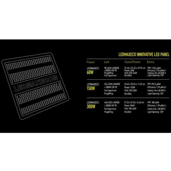 - Tecnología LED: Utiliza chips Samsung LM282B +3000K CRI90, que aseguran una luz equilibrada para todas las fases de la planta.