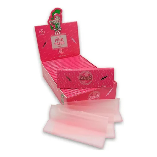 El papel Zeus Rosa de 78 mm es un papel de liar ultra fino conocido por su combustión lenta y su distintivo color rosa. Se comercializa habitualmente en librillos de 50 hojas y utiliza goma arábiga natural.